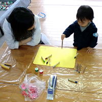右の写真。学生のひろば実習の中での手作りおもちゃ制作として行っている牛乳パック椅子作りが、最近は子ども達のお手伝いコーナーとして人気です。今日は椅子の座るところに布を貼る作業。「のり塗りなら私もできるわよ」と張り切ってのりを塗ってくれました。